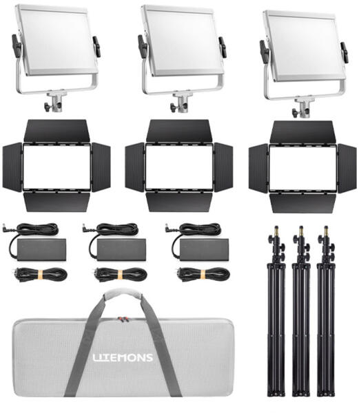 3 x Godox Litemons LP600R RGB LED fénypanel 3 x állvány 190cm 3 x tápkábel 3 x Adapter 3 x Barndoors 1 x hordtáska Sokoldalú világítási megoldás tervezők számára